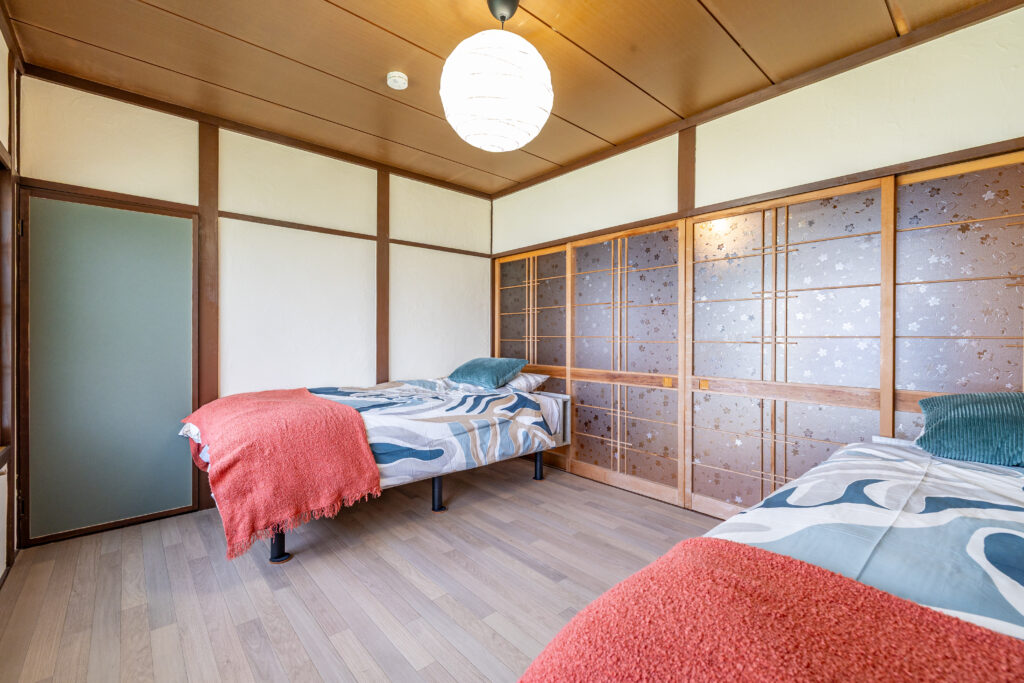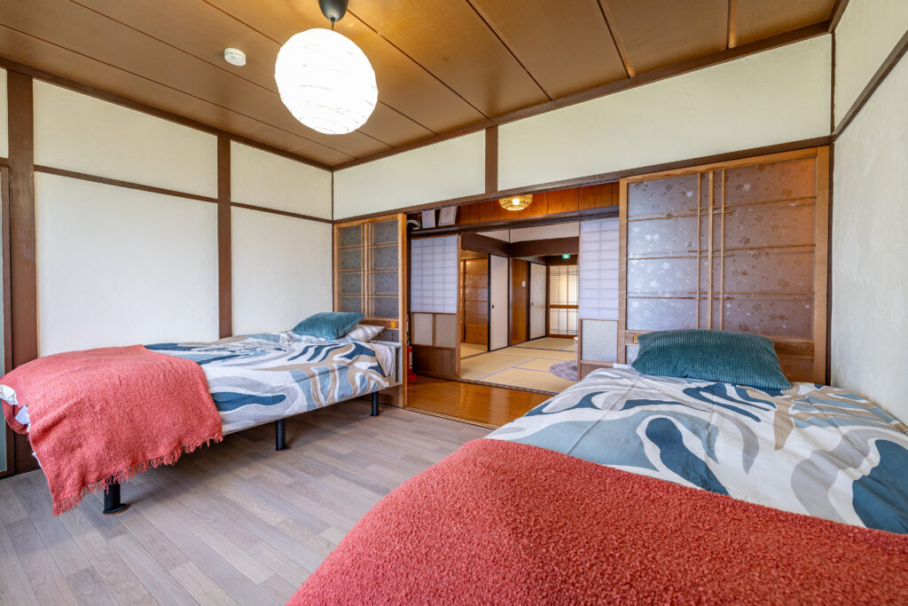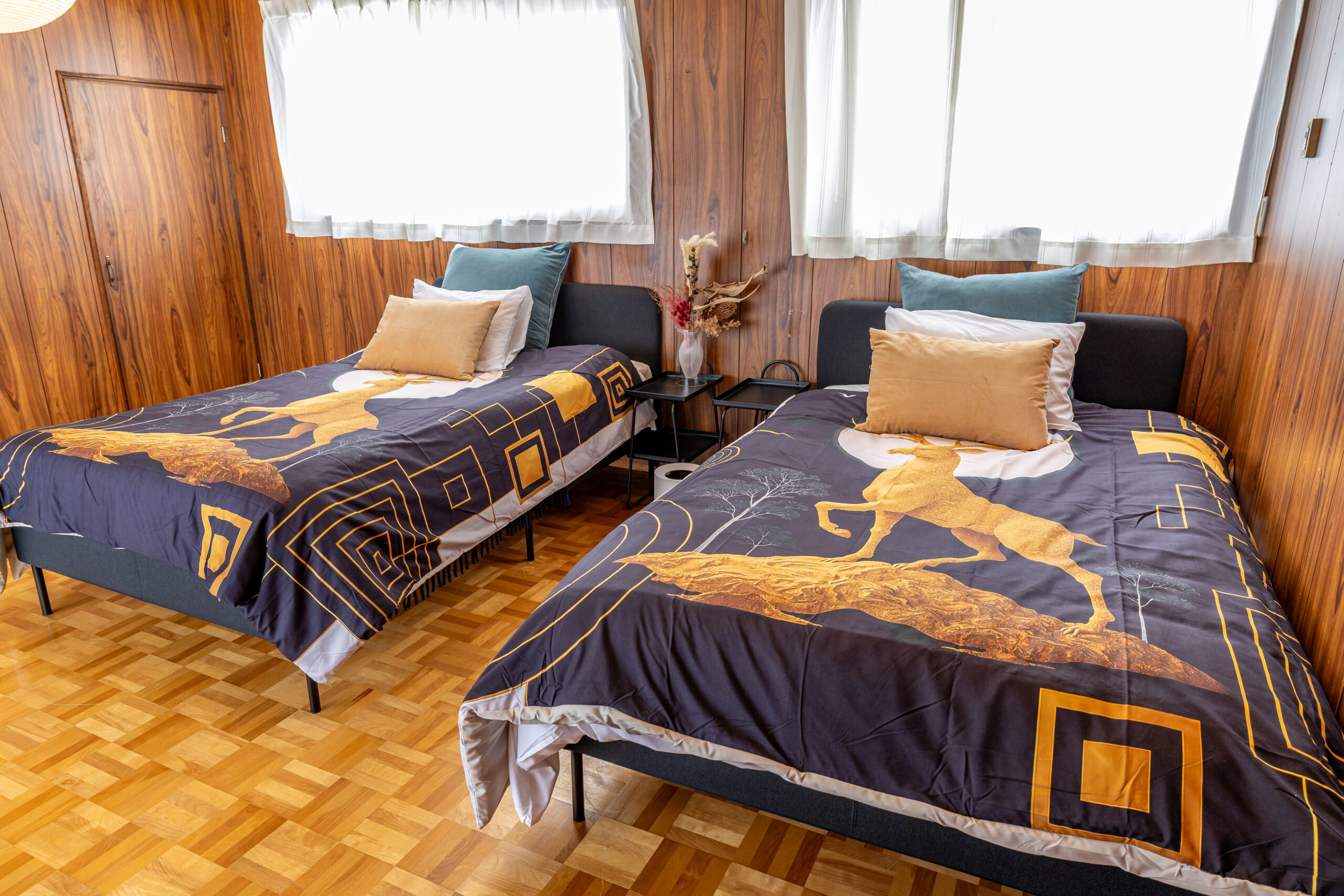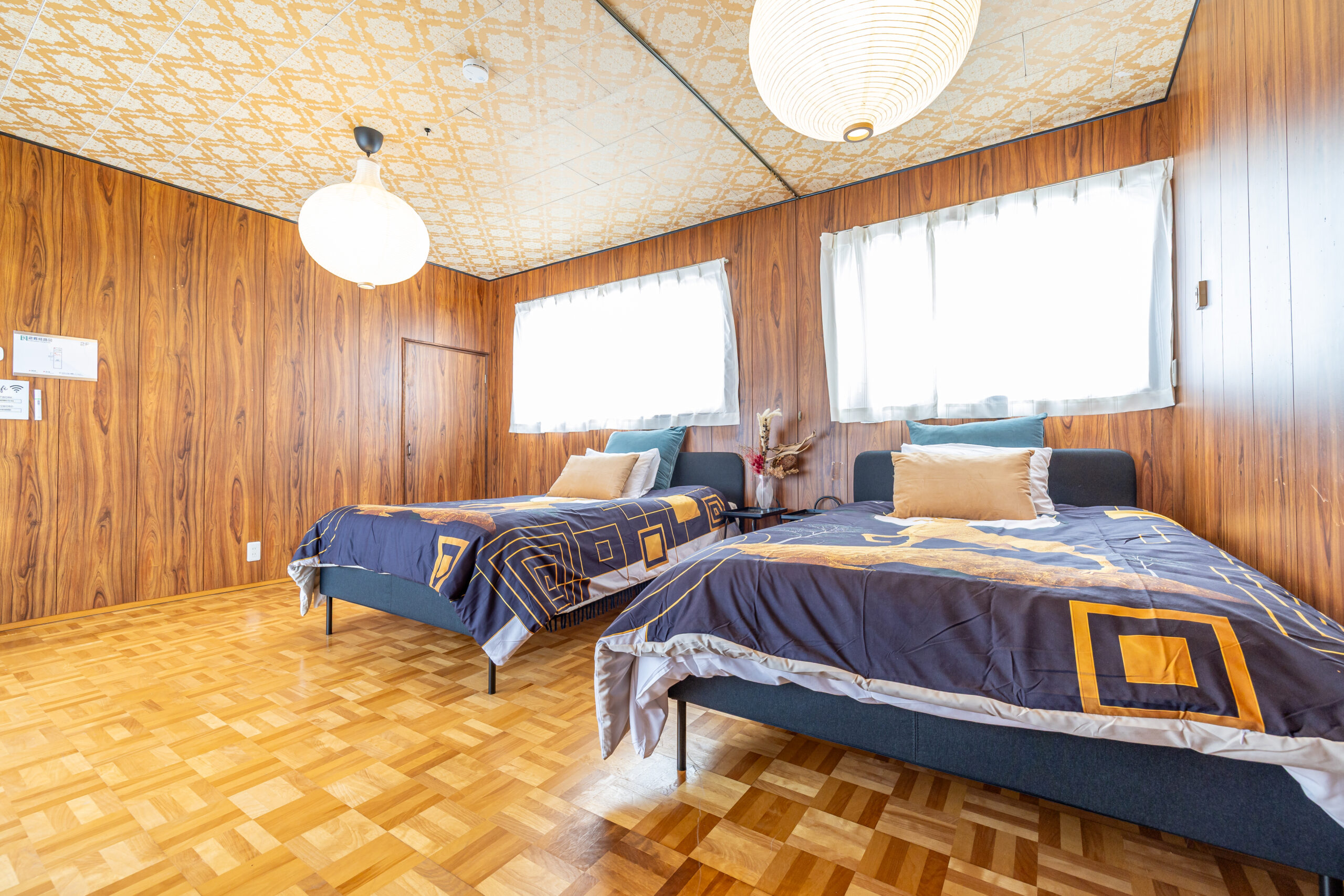 奈良市の民泊施設「Lax奈良」1階にある、ダブルベッド2台を贅沢に配置したメインベッドルーム。