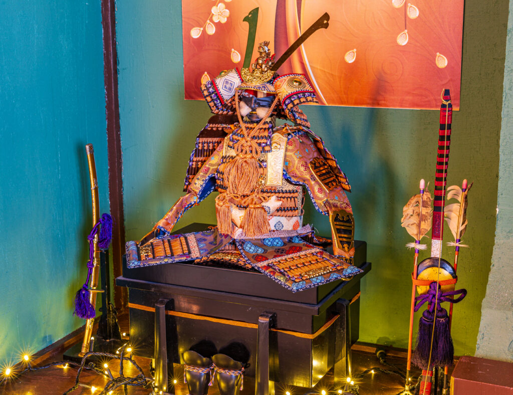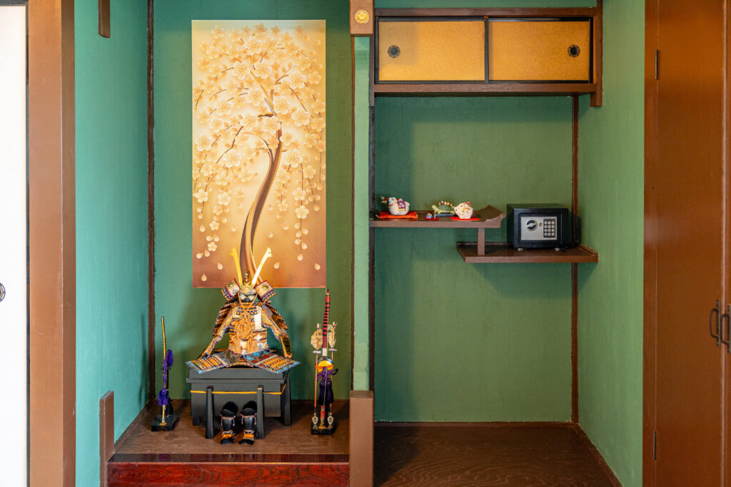 赤と黒を基調とした寝具に、伝統的な鎧飾りが飾られた、非日常感あふれる空間です。