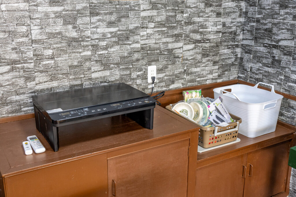 電気グリルやIHコンロ、冷蔵庫、調理器具、食器類など必要な設備はすべて揃っています。