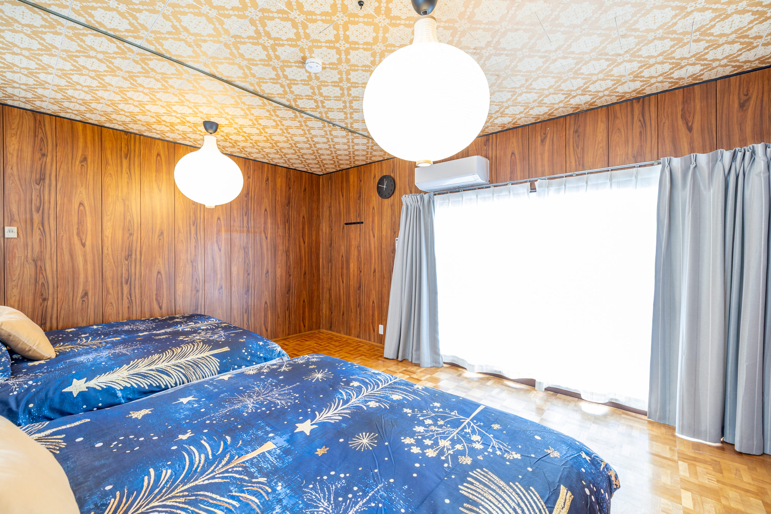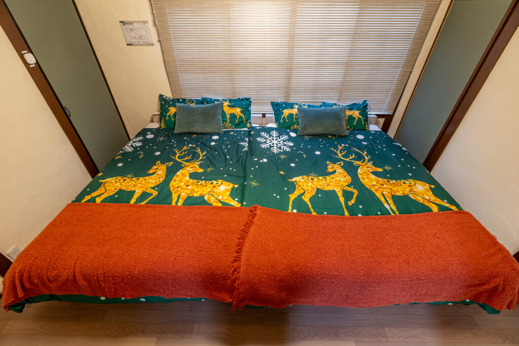 奈良市の民泊施設「Lax奈良」1階にある、ダブルベッド2台を贅沢に配置したメインベッドルーム。