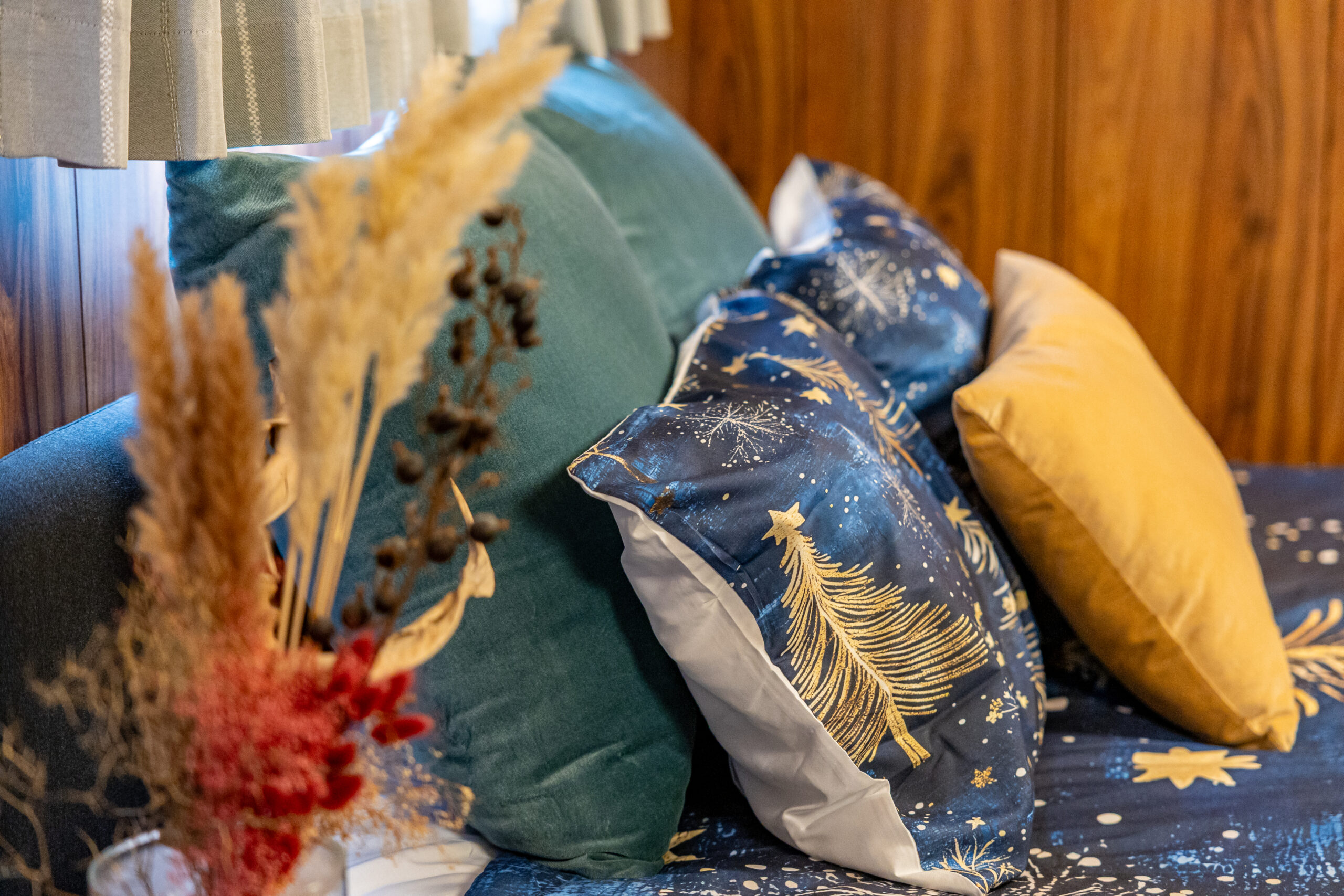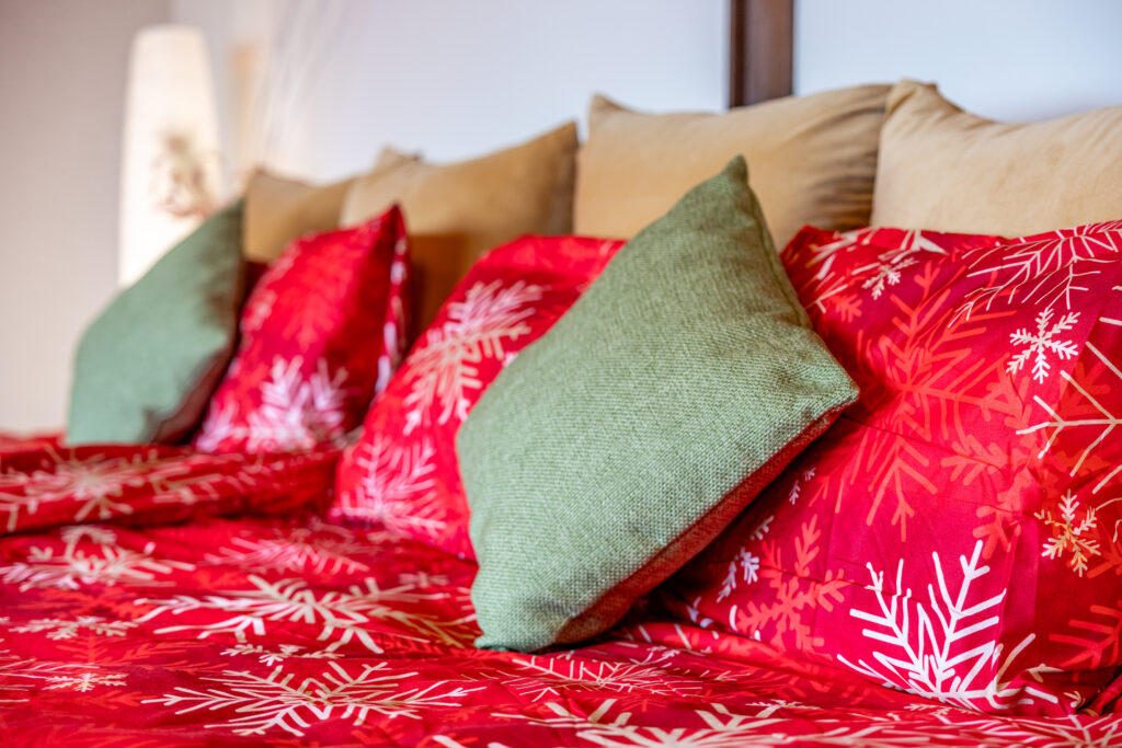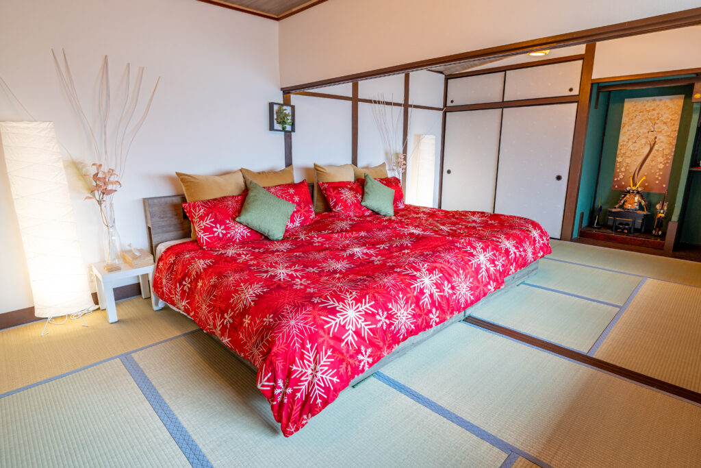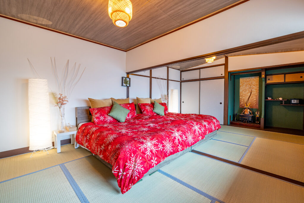 赤と黒を基調とした寝具に、伝統的な鎧飾りが飾られた、非日常感あふれる空間です。