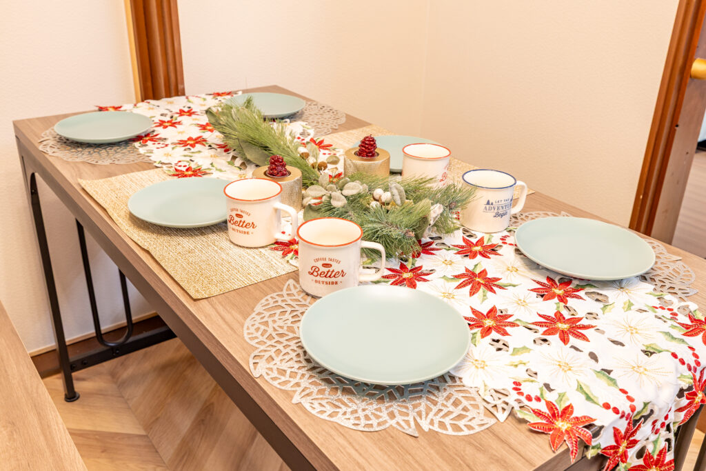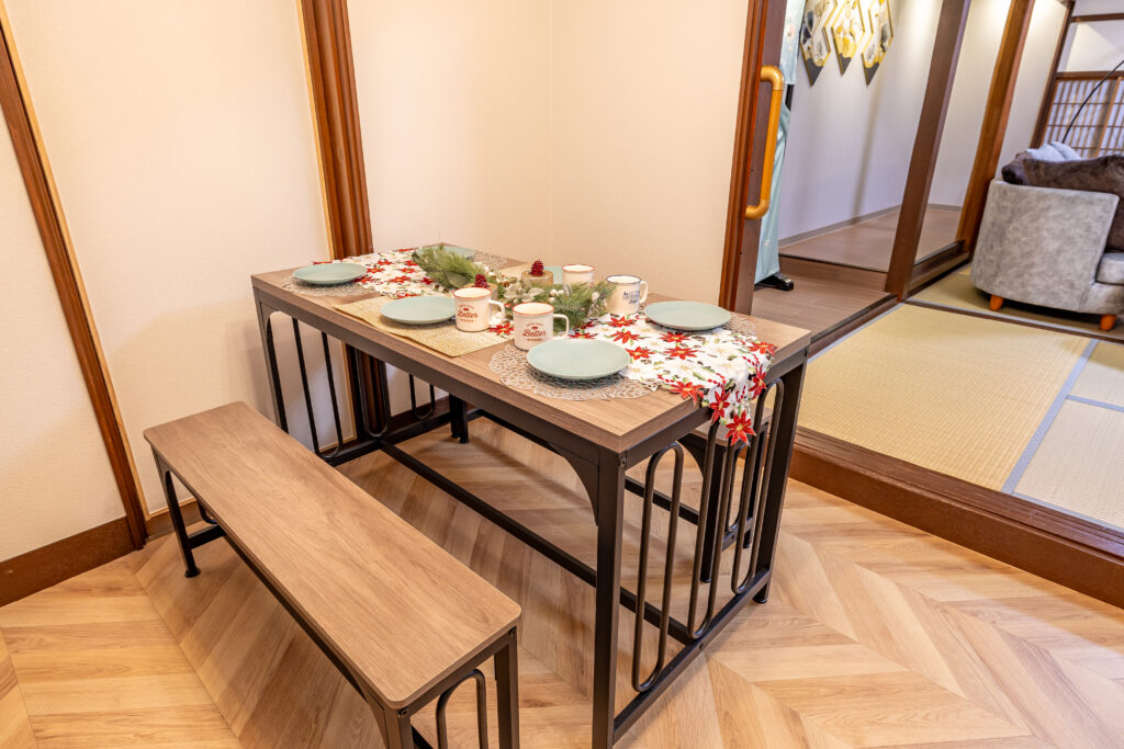木のぬくもりを感じるダイニングスペースでは、最大6名で食卓を囲めます。座卓テーブルもご用意しております。