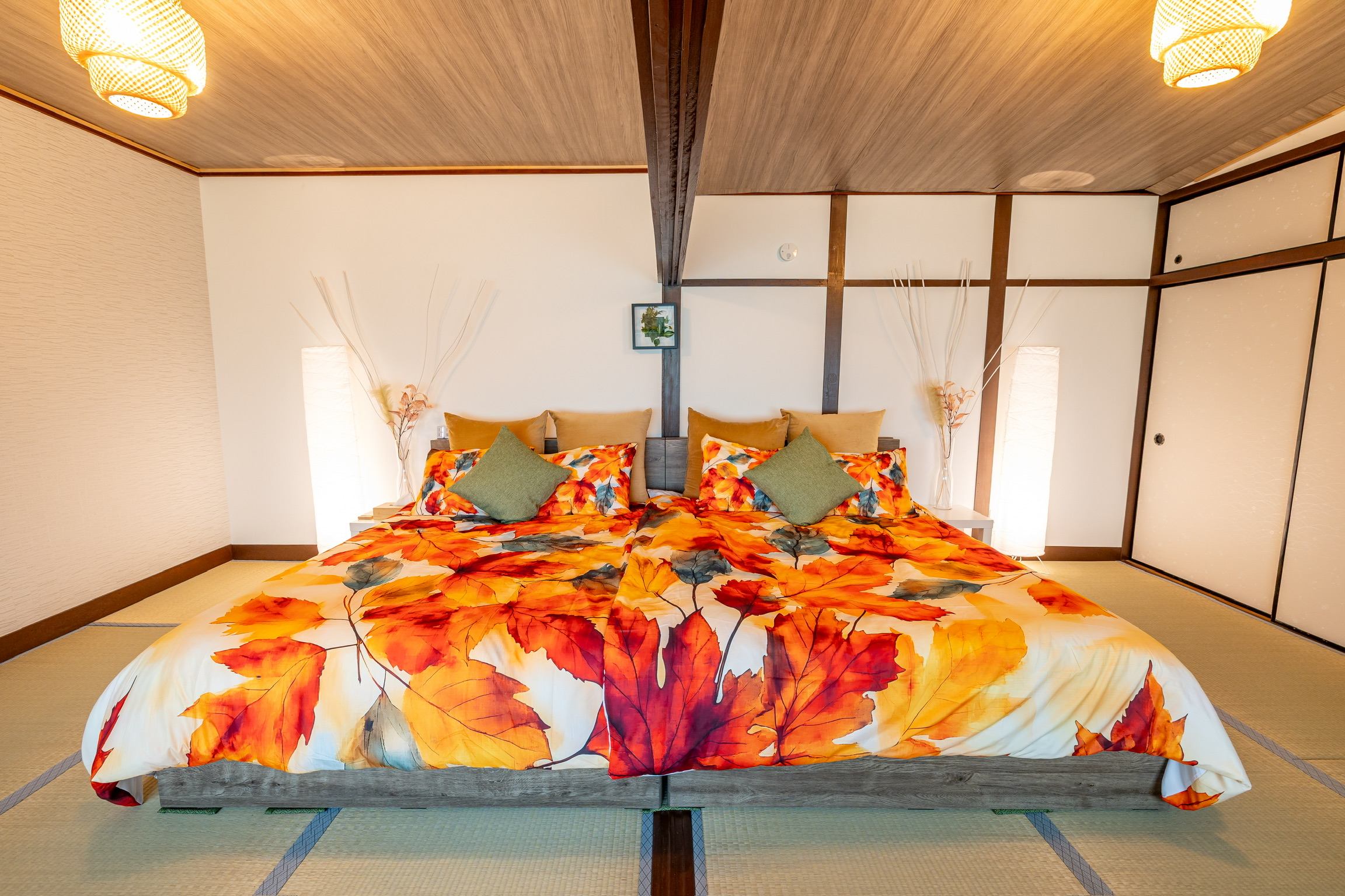 ベッドルームには紅葉柄のカバーを使用し、心地よく落ち着いた空間に。窓の外に広がる奈良の自然と相まって、より一層季節を感じながらお過ごしいただけます。
