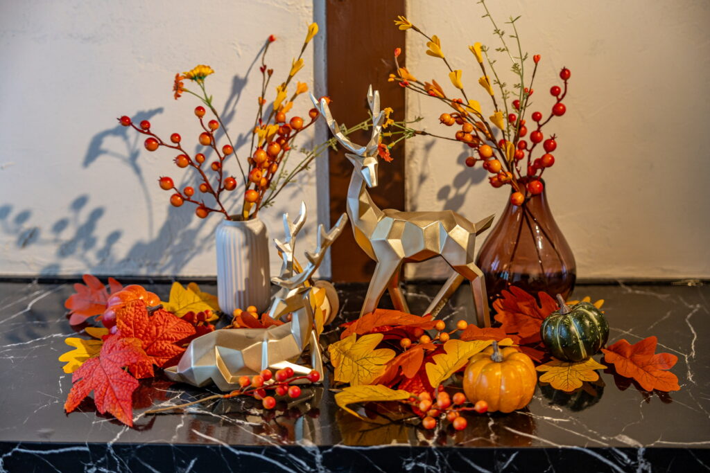 館内には紅葉をイメージした鮮やかなオレンジや赤を取り入れ、リビングやベッドルームを秋色に統一しました。さらにエクステリアには鹿のオブジェと落ち葉・紅葉をモチーフにしたインテリアを配置し、外からも秋の雰囲気を楽しんでいただけます。